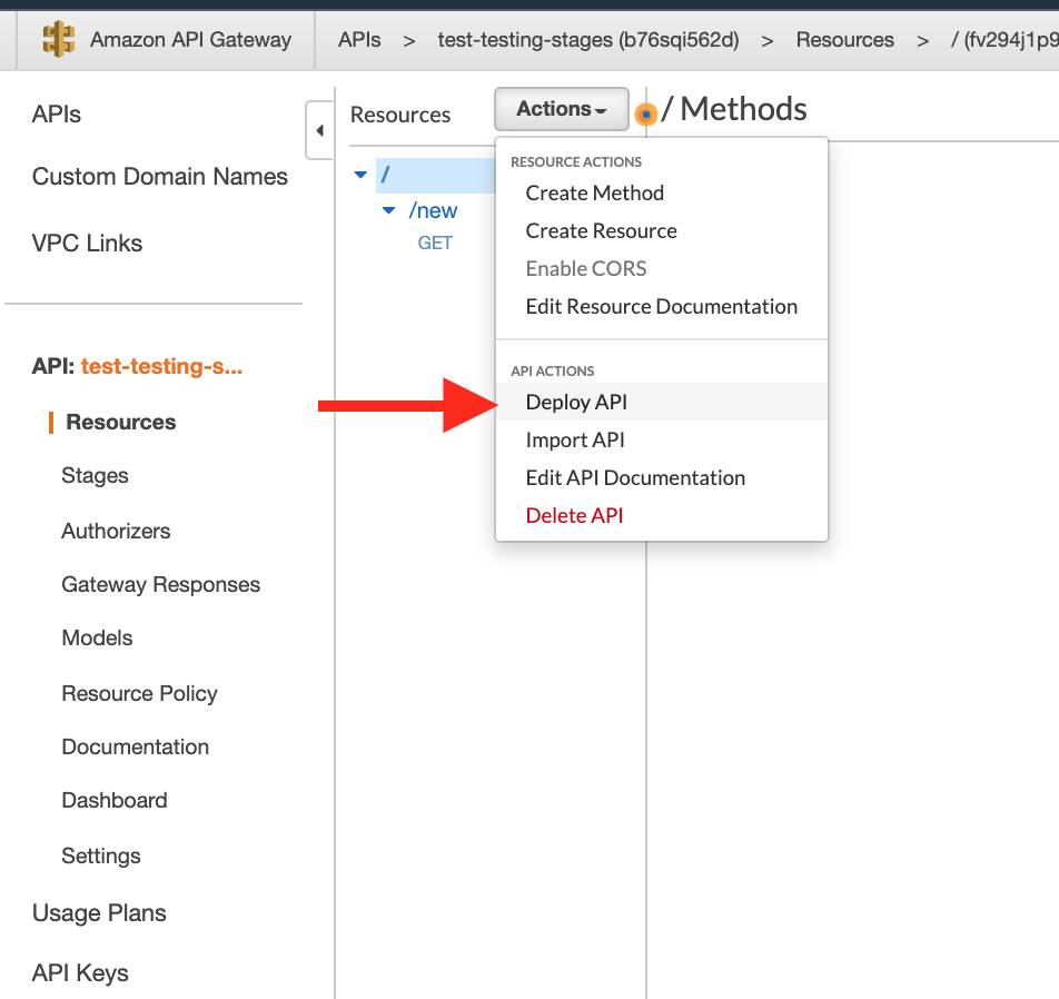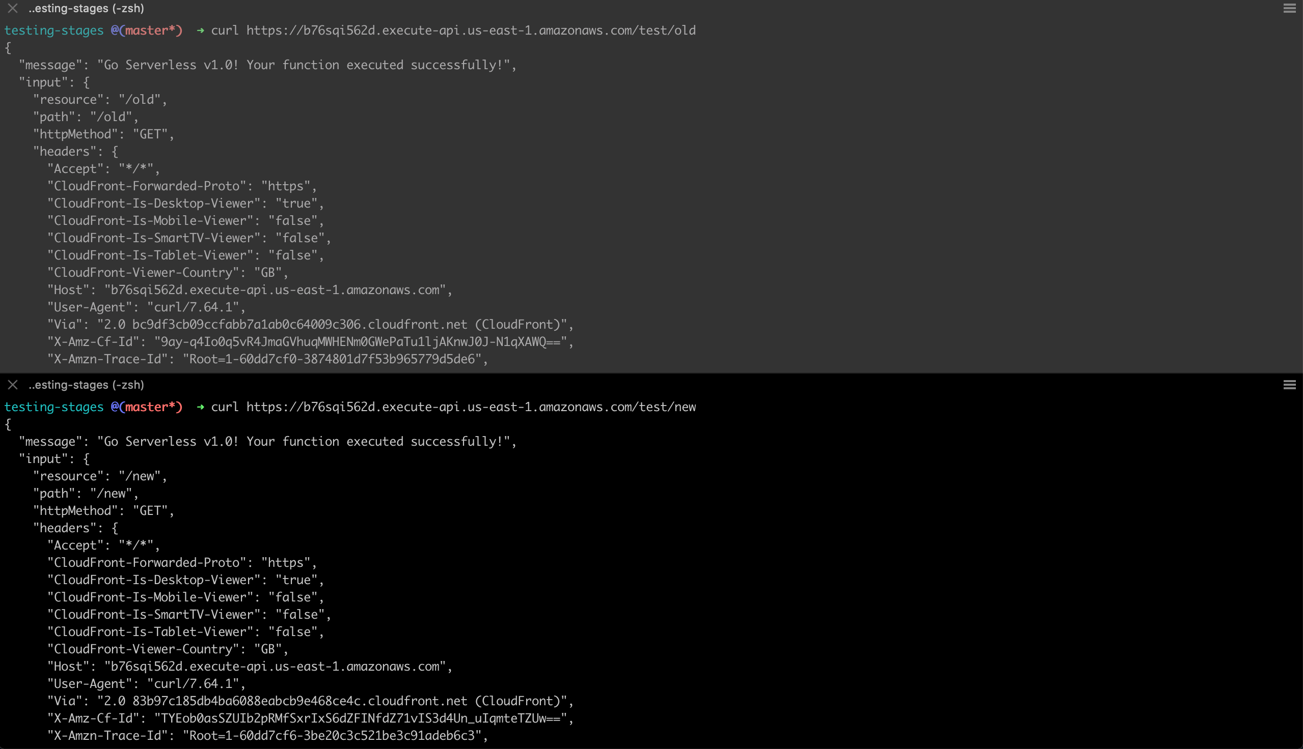 /old route to /new and deploy sls deploy --stage test -v - we now have /old and /new routes in the Stages area